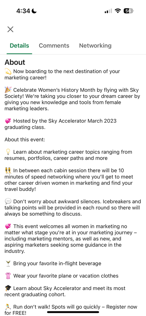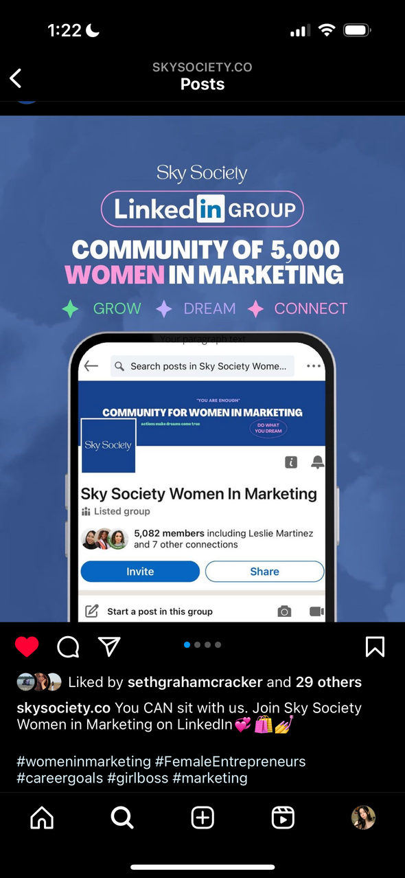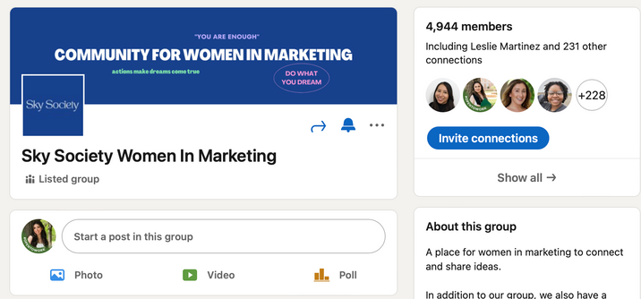 Help brainstorm ideas for virtual events and design promotional posts to drive traffic to Sky Society LinkedIn group.
